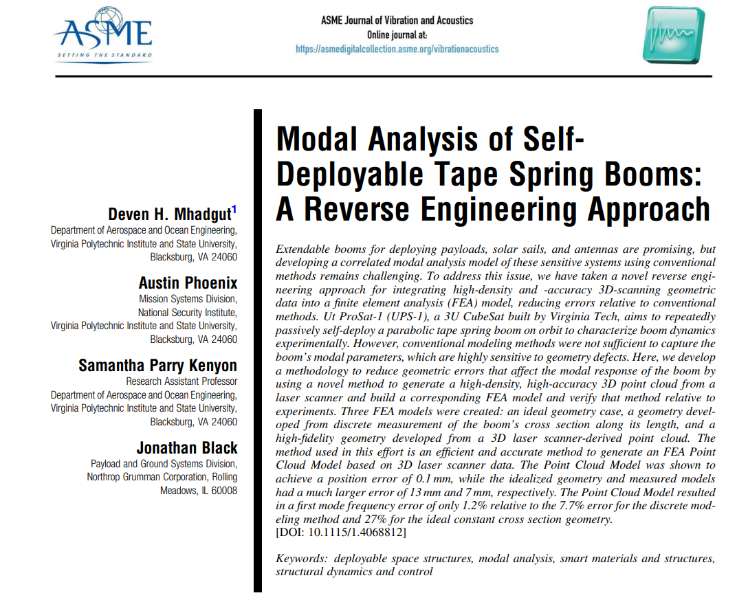 My PhD research is focused on the structural dynamics of deployable tape-spring booms. The boom under study is bistable, and a replica is planned to be the primary payload on board Ut ProSat-1, a student-built satellite at Virginia Tech. The boom will be deployed passively and then retracted using a stepper motor. The deployer has a novel design and its performance will be tested in space. The satellite has two IMUs: one at the boom tip (on a flex circuit) and another inside the satellite on a PCB. In the absence of an active vibration source, these sensors measure the transverse acceleration at the end of each deployment. I plan to replicate those results on the ground. Last year, I determined that FEA using conventional CAD approaches was insufficient for these thin deployable structures. Consequently, I adopted a reverse engineering approach for modal analysis, utilizing a higher fidelity 3D scanned model to achieve better correlation. The next step was to start with the actual environmental simulations. I began with thermal vacuum tests in our environmental chamber. I also focused on an experimental data-driven modeling approach to obtain material parameters based solely on system input and output via vector fitting. While these data-driven models demonstrated higher accuracy, I found that the system varies significantly with changes in loading, and I am planning to use parametric modeling to improve upon that.